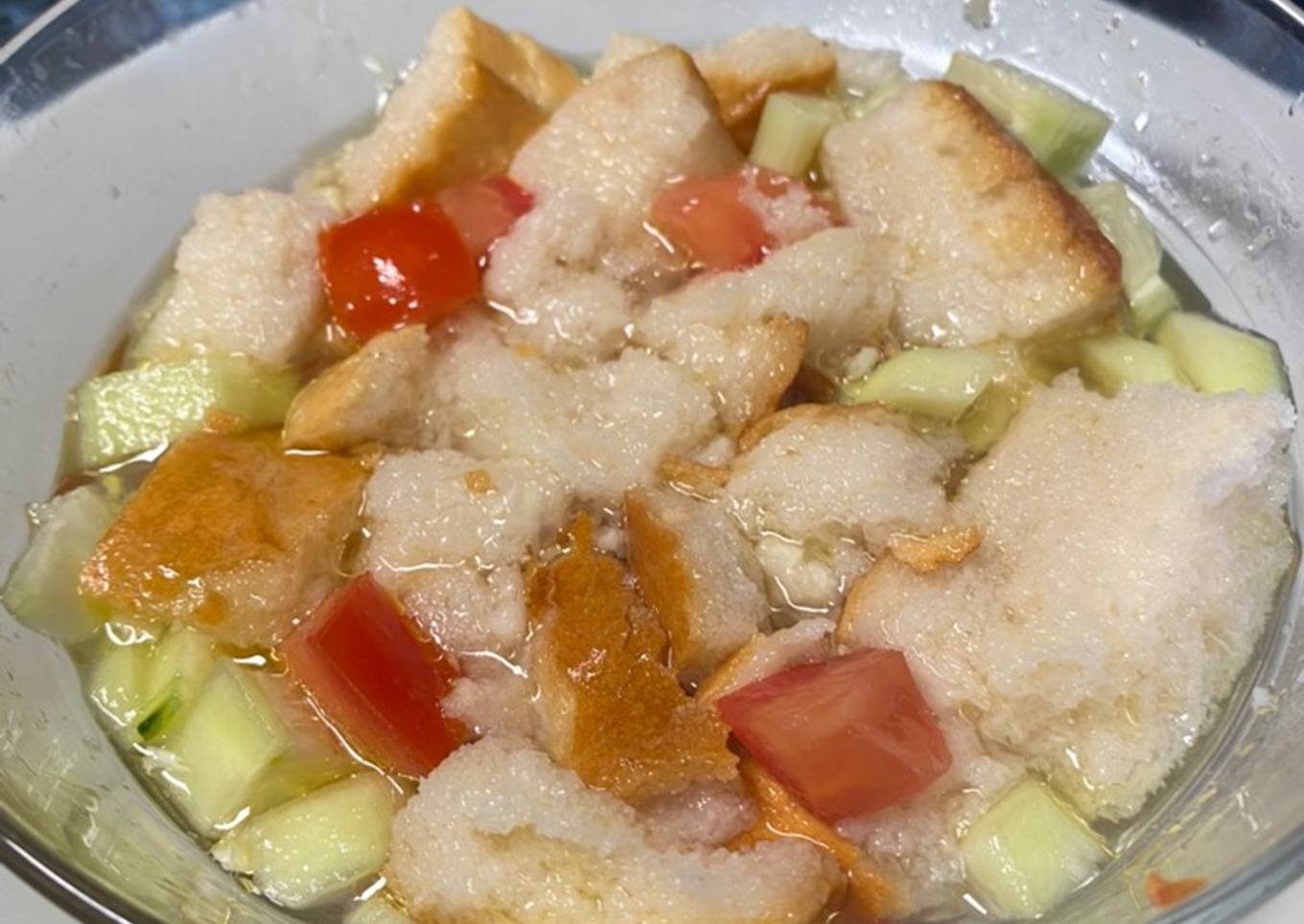 - Mezclar en el bol y añadirle unos trozos de pan. Reservar en la nevera hasta el momento de servir.