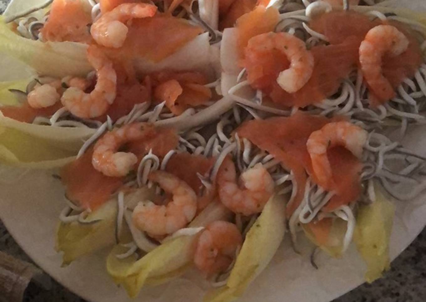 - Coloca las colas de langostino, dos por cada pareja de hojas de endivias