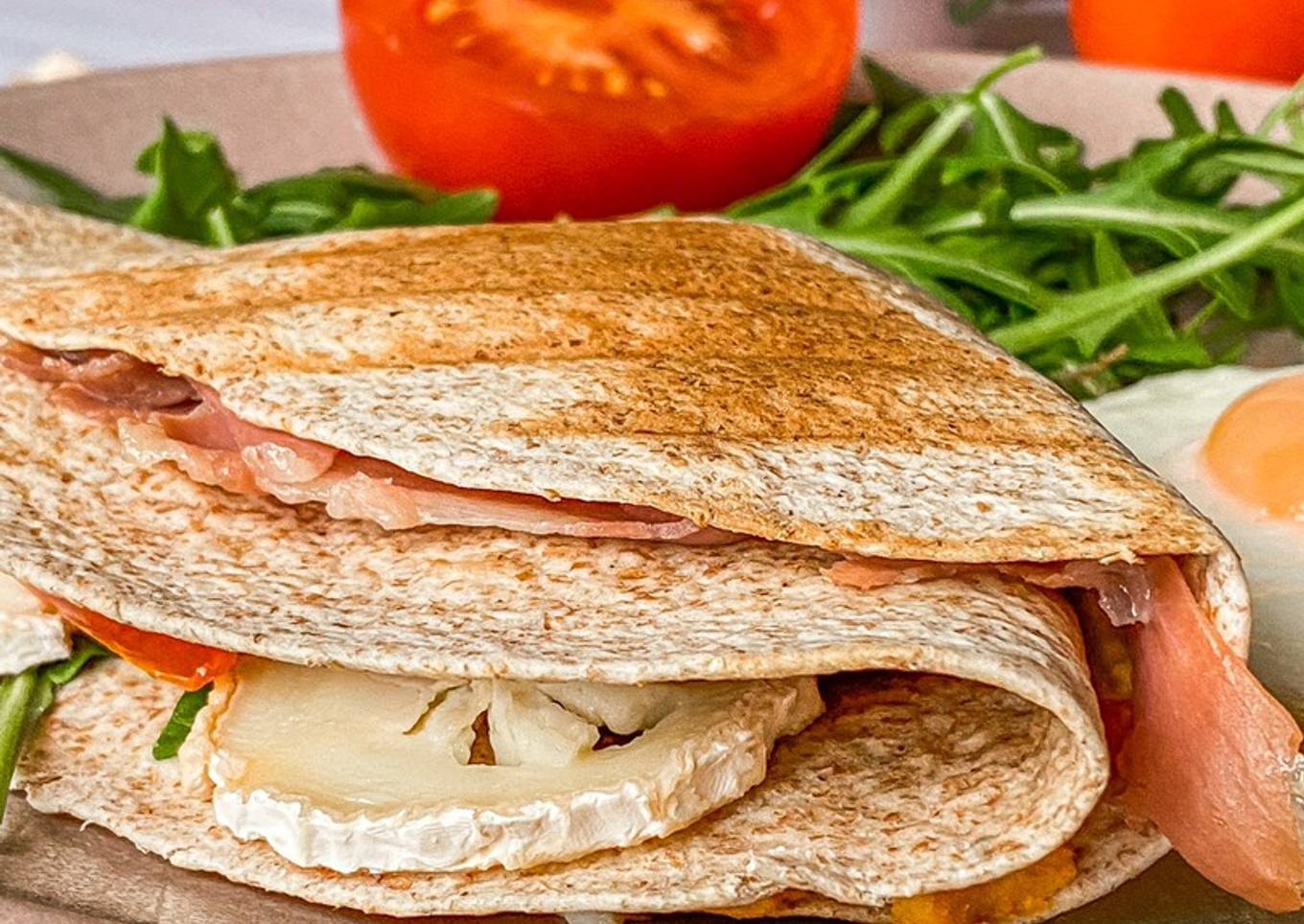 - Rellenamos poniendo en un cuarto de la tortilla el hummus, en otro el jamón, en otro las rodajas de tomate y en otro la rúcula con el rulo de cabra y doblamos cuarto a cuarto hasta cerrar la quesadilla