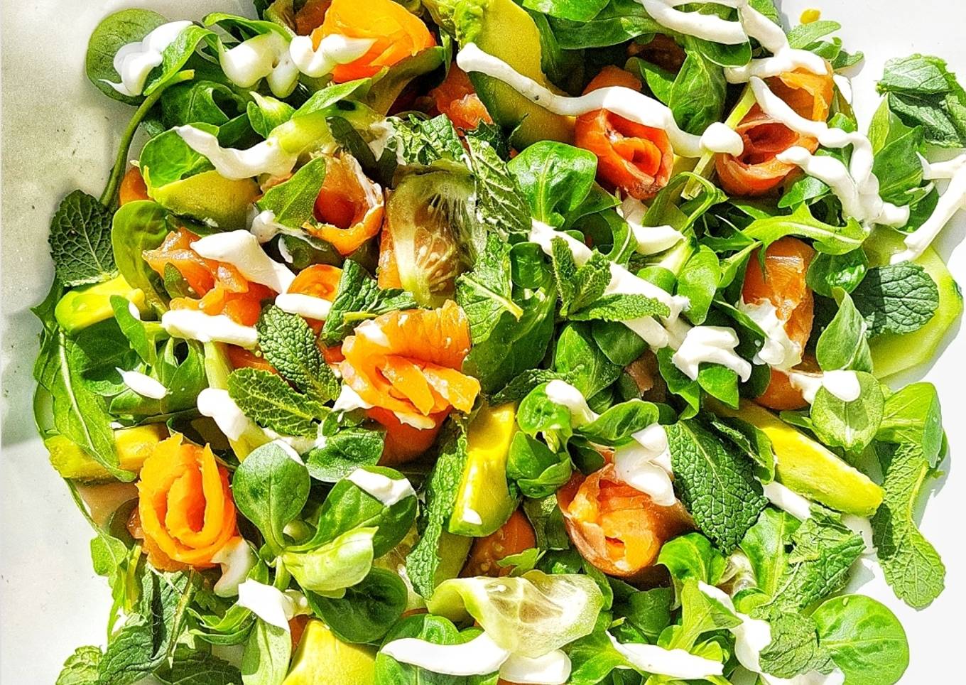 Ensalada de salmón ahumado con aderezo de pepino y yogur