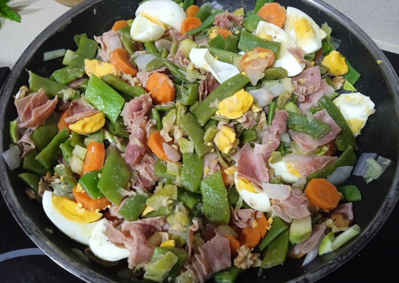 - Retiramos huevos y verduras al vapor, colamos, pelamos y picamos los huevos y añadimos todo a la sartén. Mezclar todo bien