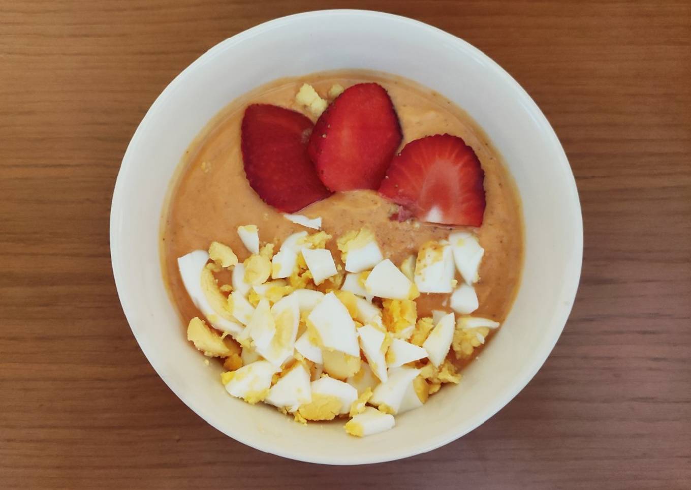 - Sírvelo frío acompañado de huevo cocido y una fresa en láminas o taquitos de jamón. Lo que sobre consérvalo en la nevera en un táper o tarros de cristal