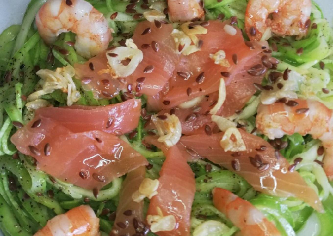 Espaguetis de calabacín, salmón ahumado y langostinos