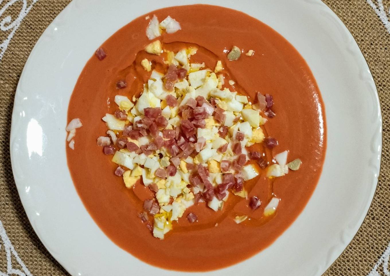 - Una vez mezclado bien, se rectifica de vinagre y sal... nuevamente pondremos unos 8' a velocidad máx. hasta que quede espeso. (A mí me gusta que no quede muy espeso, suelo añadir un chorrito de agua). Picamos el huevo y lo reservamos.