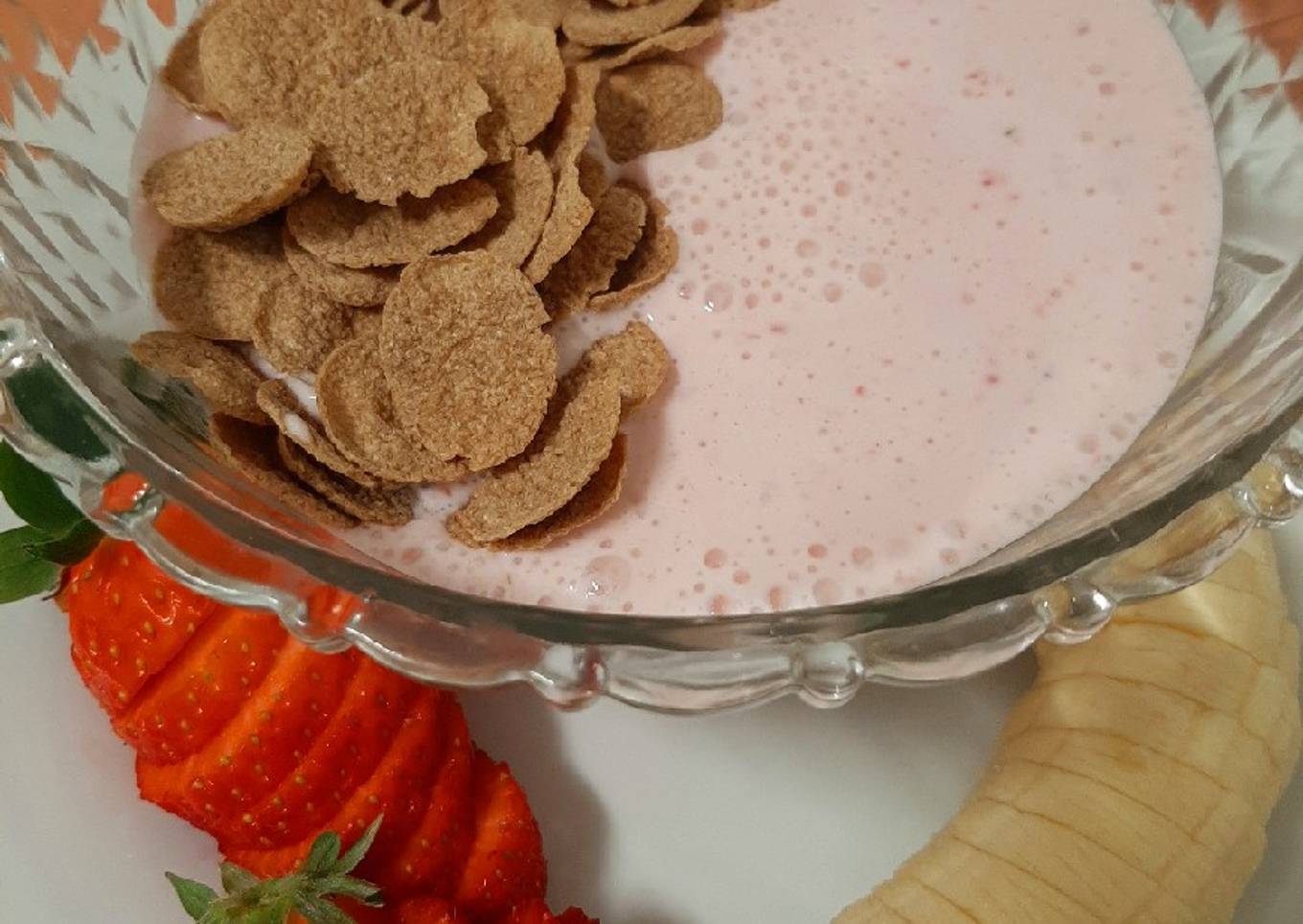 - En un vaso de batidora echamos 4 fresas troceadas, yogurt, leche, canela y el edulcorante que prefiramos, batimos y vertemos en un cuenco.