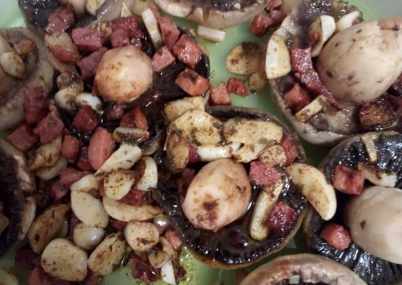- Fuego para que evapore, llegado este punto sacamos los champis con cuidado y colocamos en una fuente y echamos encima el refrito. Listo a disfrutar.