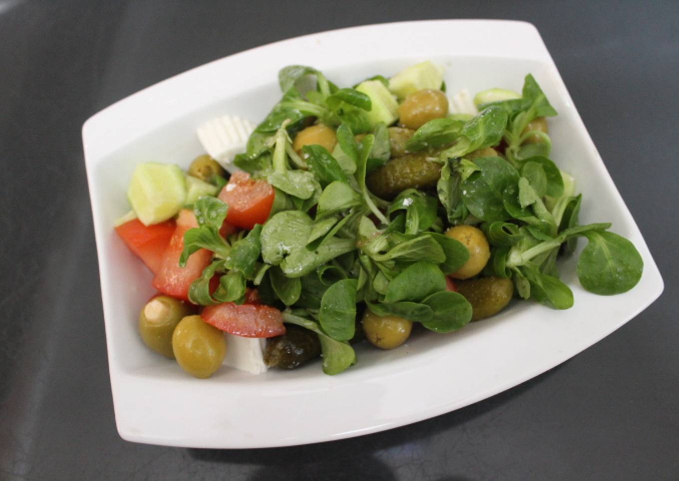 - Colocamos en una fuente los canónigos, los encurtidos, el tomate, el pepino y el queso, sazonamos, rociamos con aceite y removemos.