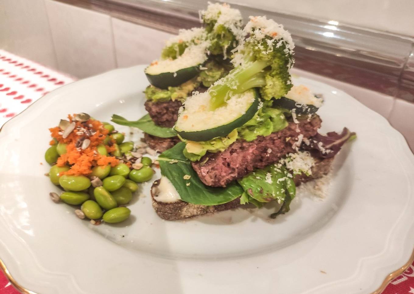 - A continuación, corta la hamburguesa por la mitad para que puedas comértela más fácilmente. Añade 1/3 de aguacate machacada a cada hamburguesa y échale un toque de lima, orégano, pimienta y aceite de oliva. Luego, añade 4 rodajas muy finas de calabacín a cada hamburguesa (si quieres puedes hacerlo en la sartén a fuego lento durante 3 minutos) y termina poniendo 2 arbolitos de brócoli a cada hamburguesa (puedes trocearlos).