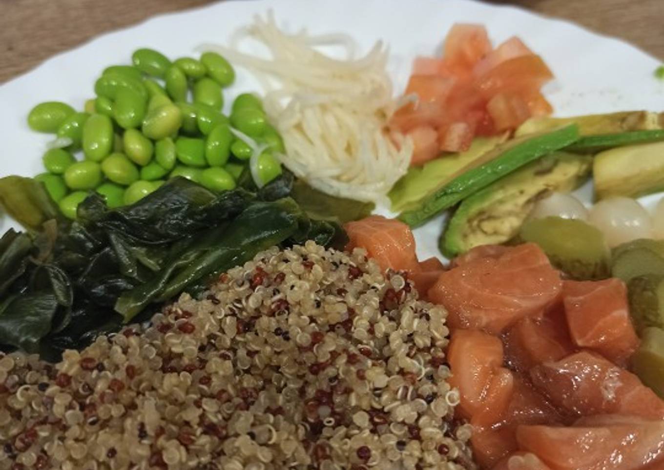 - Preparar el resto de ingredientes al gusto y según las instrucciones de los envases. Ponemos unos 3-5 ingredientes además del pescado y el arroz/quinoa.