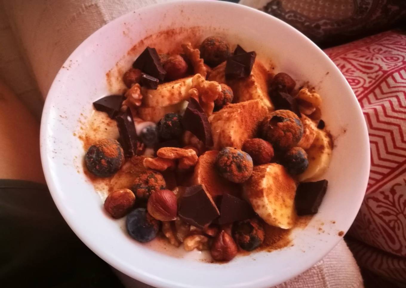 - A continuación añadimos la mezcla de frutos secos, en este caso use nueces y avellanas(naturales),onza de chocolate a trocitos y una cucharadita de canela.