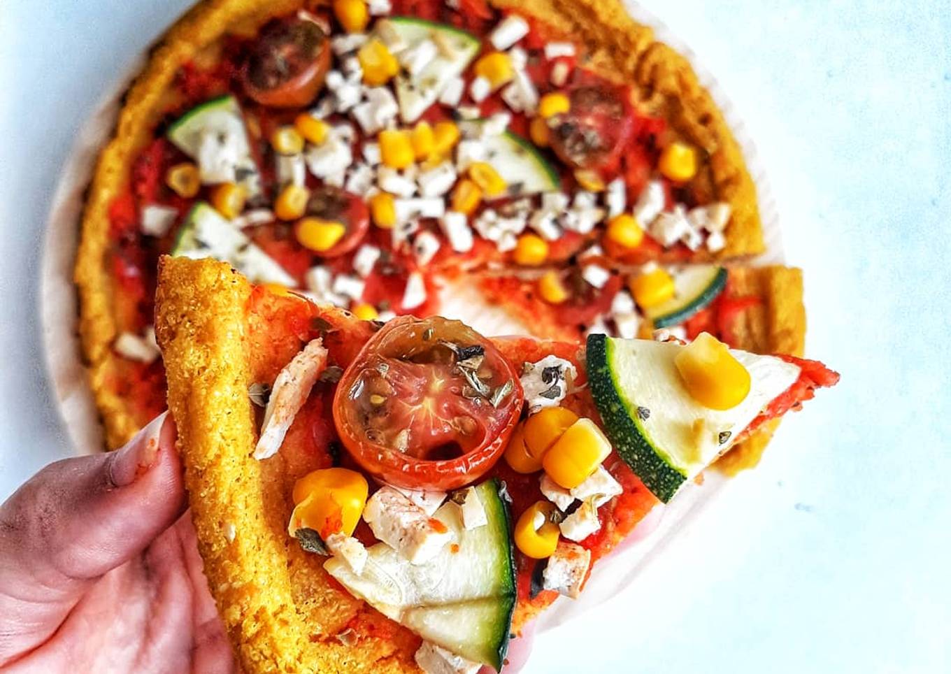 - Lavamos la coliflor y cortamos, metemos en la picadora y trituramos bien, añadimos la harina de garbanzo, sal, el agua y las especias y volvemos a triturar hasta obtener una masa. Cogemos la bandeja del horno y le ponemos papel vegetal, echamos encima la masa y damos forma de pizza, metemos en el horno precalentado a 200° unos 20 minutos, sacamos y añadimos nuestros ingredientes preferidos, volvemos a meter en el horno unos 15 minutos. Sacamos y ya estaría lista para comer.😃💚