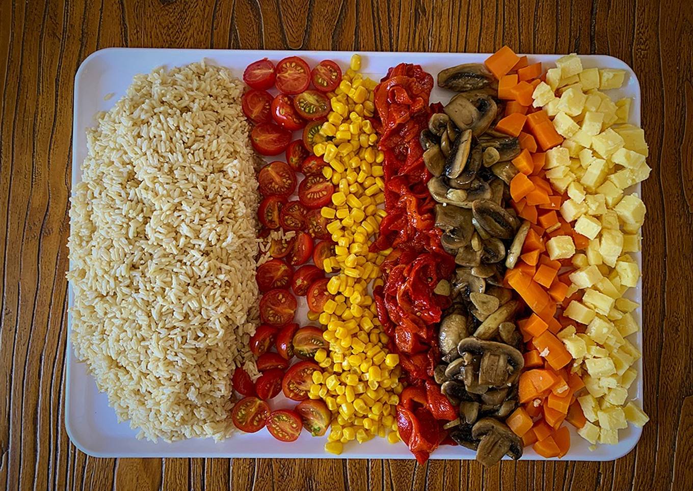 - Y ya podemos montar la ensalada. Recomiendo en una bandeja amplia para llevarla a la mesa. Más vistoso y luego cada cual que se sirva de lo que más le guste. Ponemos el arroz y jugamos con los colores: luego cherrys y millo