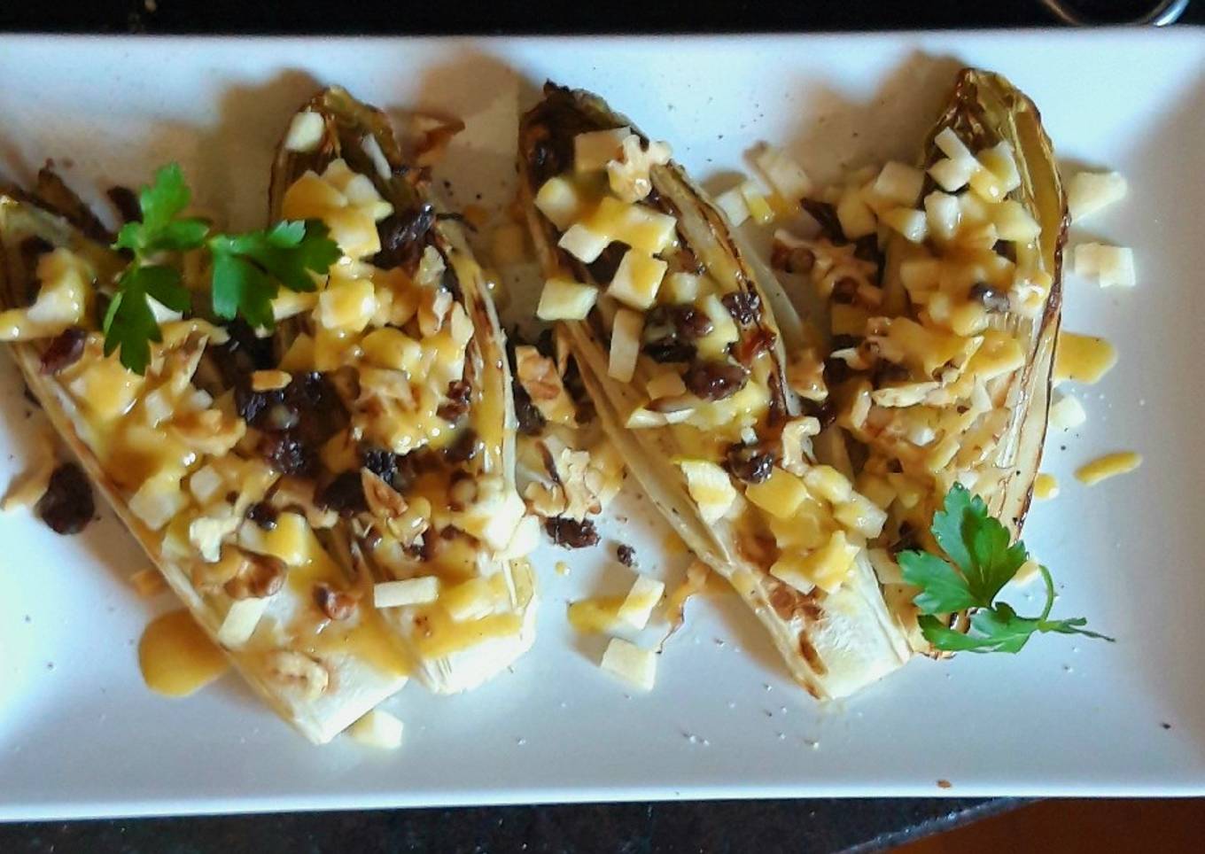 - Servimos las endivias con el tartar de manzana, la vinagreta, y un poco de perejil picado por encima. Que aproveche