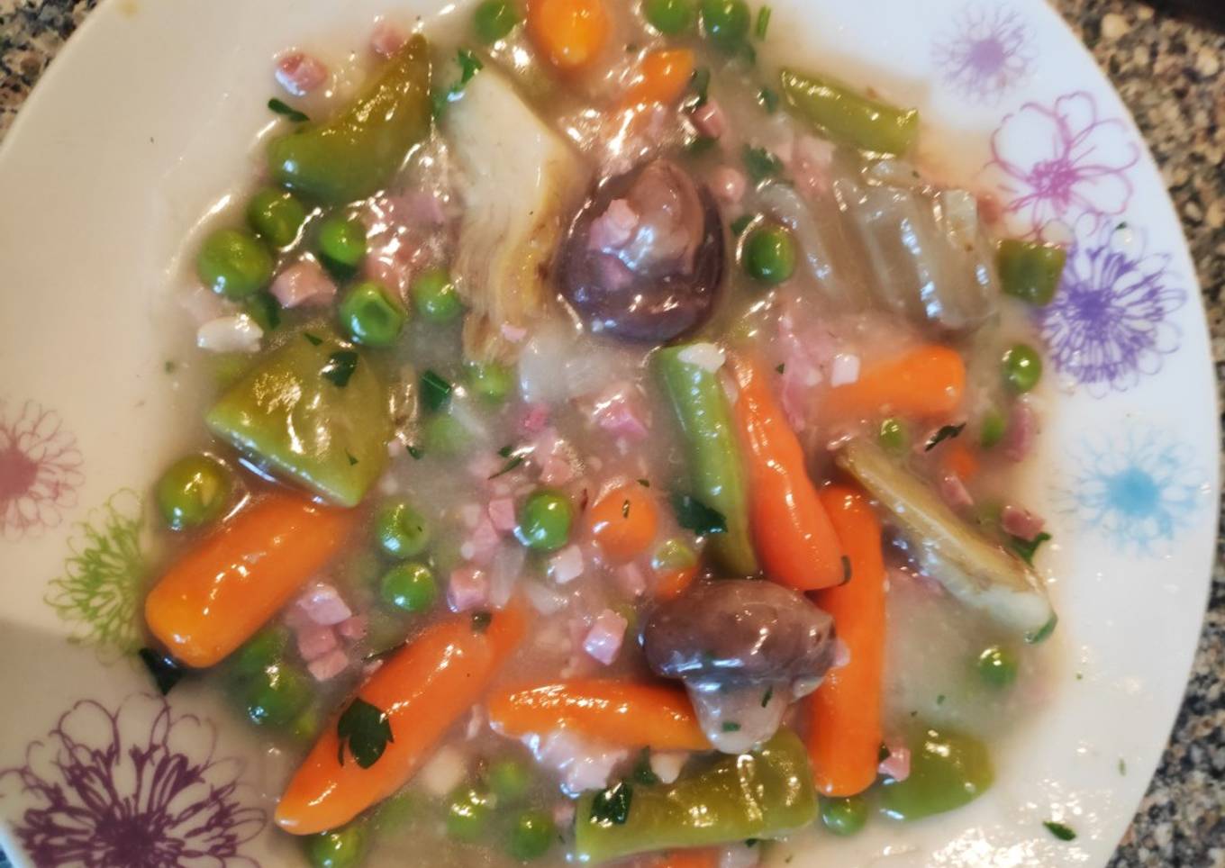 Instructions to make to make Menestra congelada de verduras en salsa verde con jamón