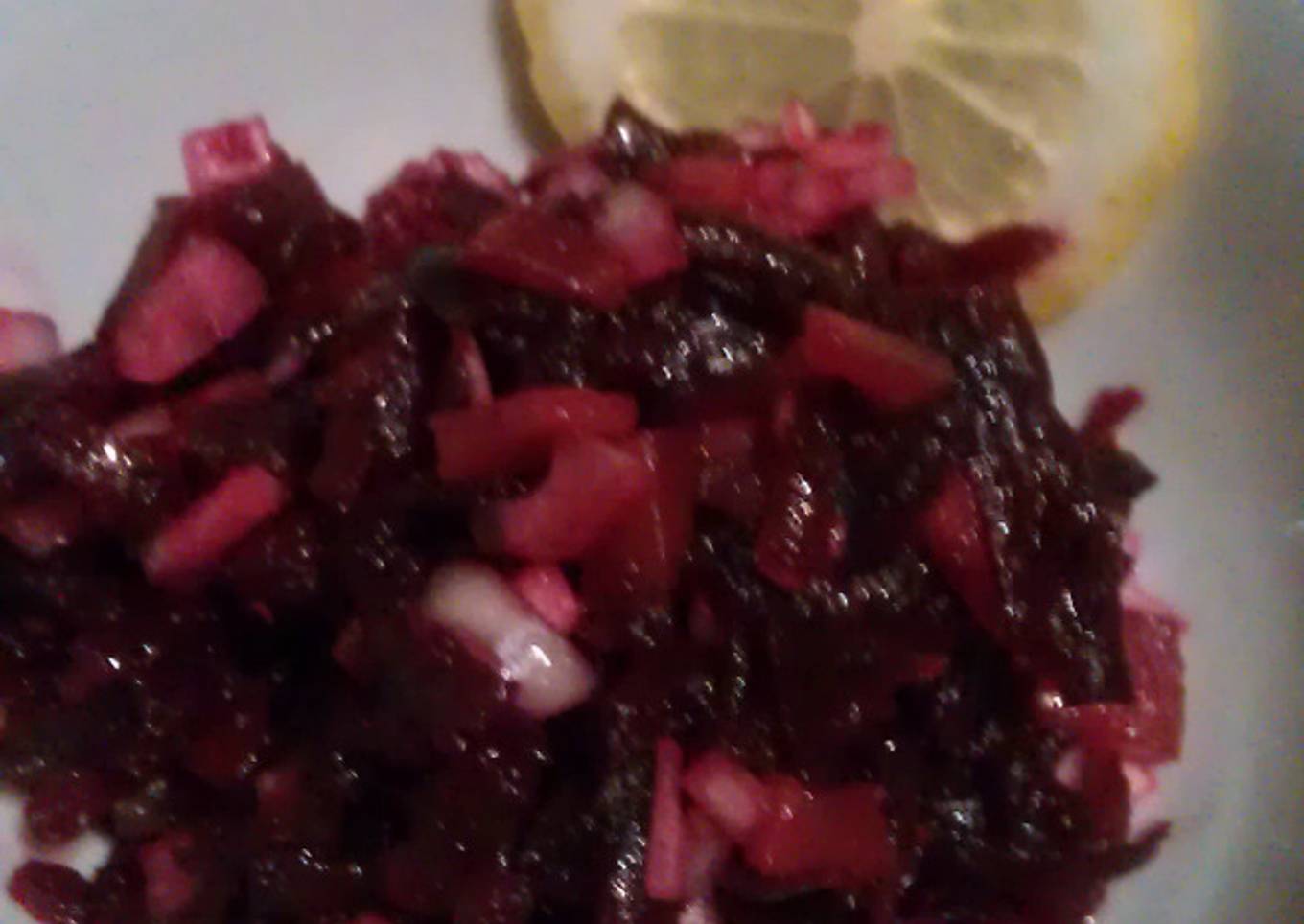 Ensalada de remolacha, pepino encurtido y cebolla blanca