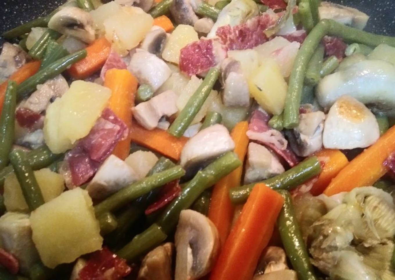- Añadir a esta sartén las verduras, salarlas y saltearlas en conjunto con el jamón y el ajo