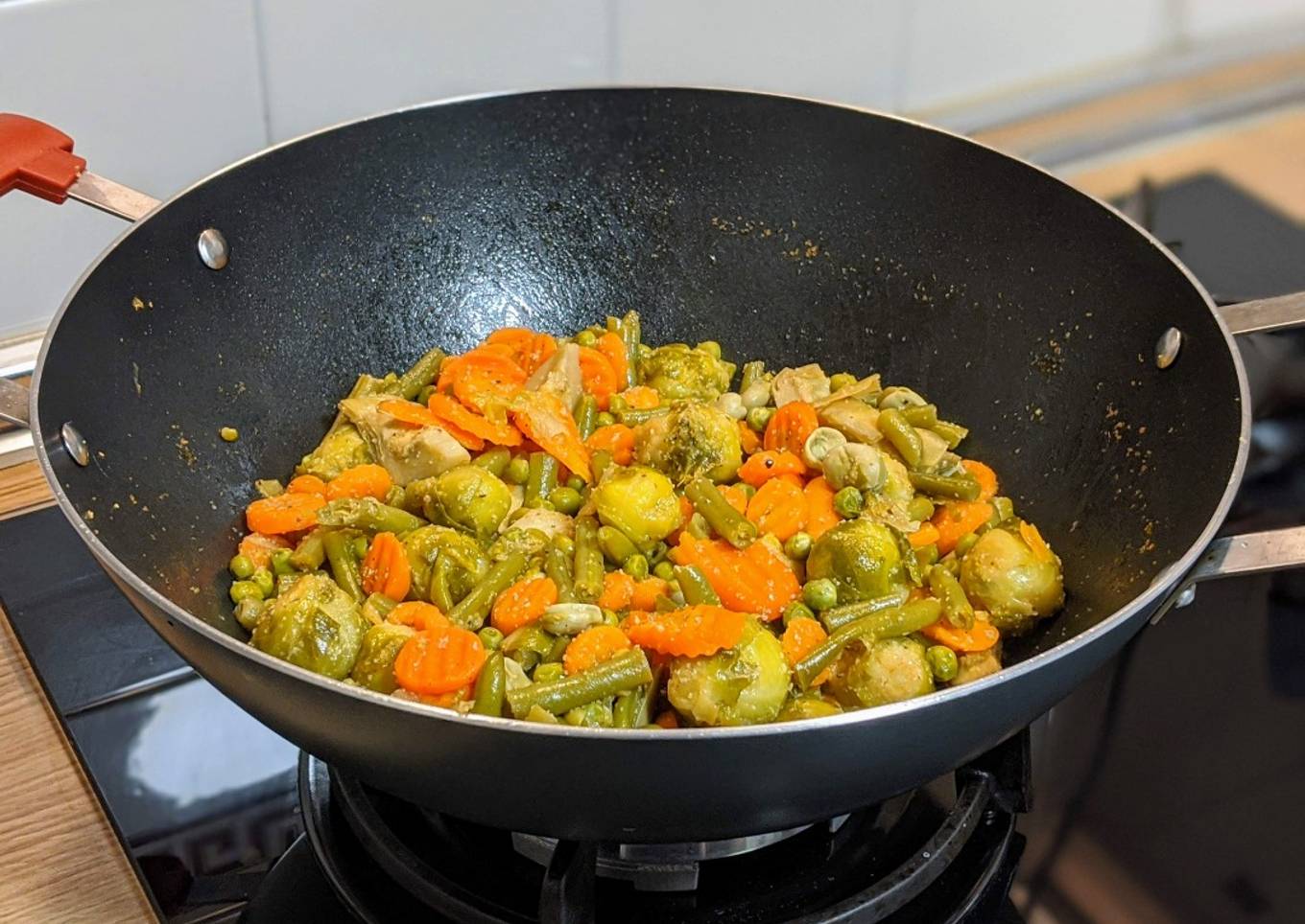 - Ponemos a calentar el wok en seco a fuego alto. Cuando alcance temperatura, añadimos las verduras sin descongelar y removemos con frecuencia durante unos minutos.