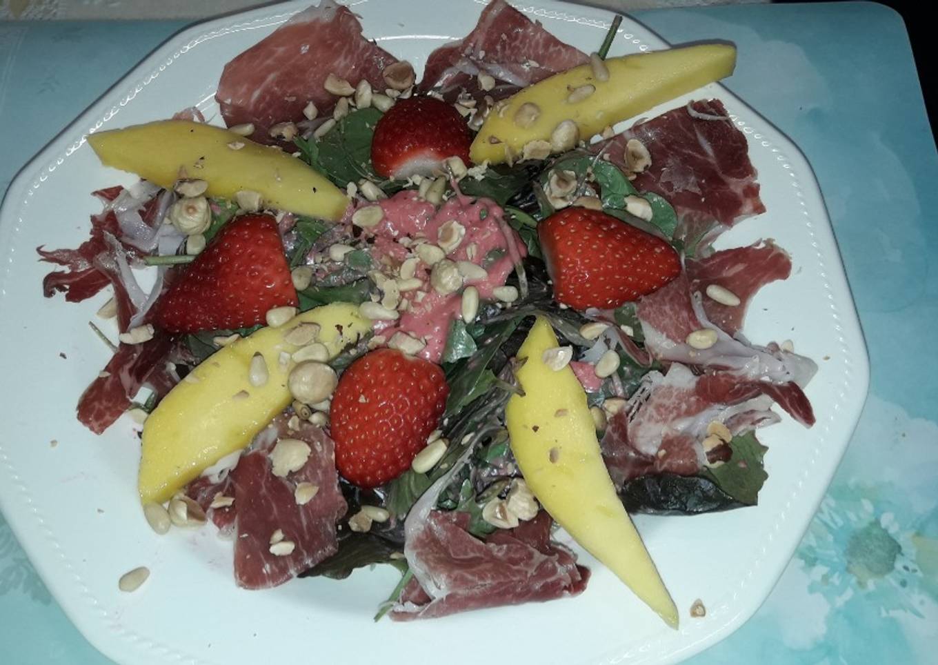 Ensaladas variadas con mango, fresas, jamón, frutos seos y vinagreta de frambuesas