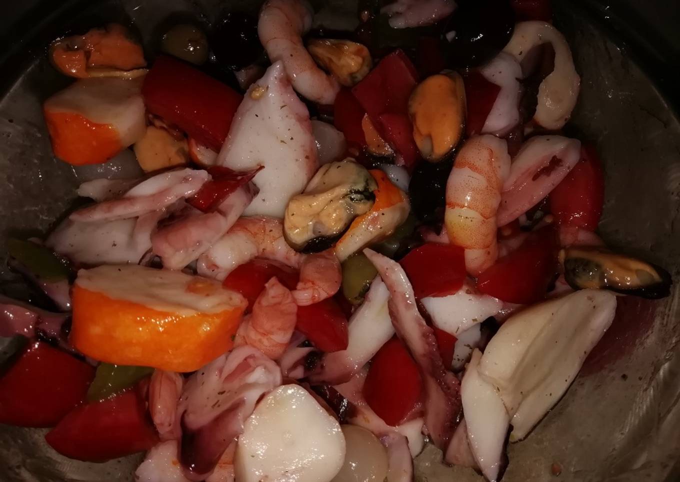 - Echamos las aceitunas, los mejillones escurridos, los palitos de cangrejo, las cebollas y los langostinos pelados.