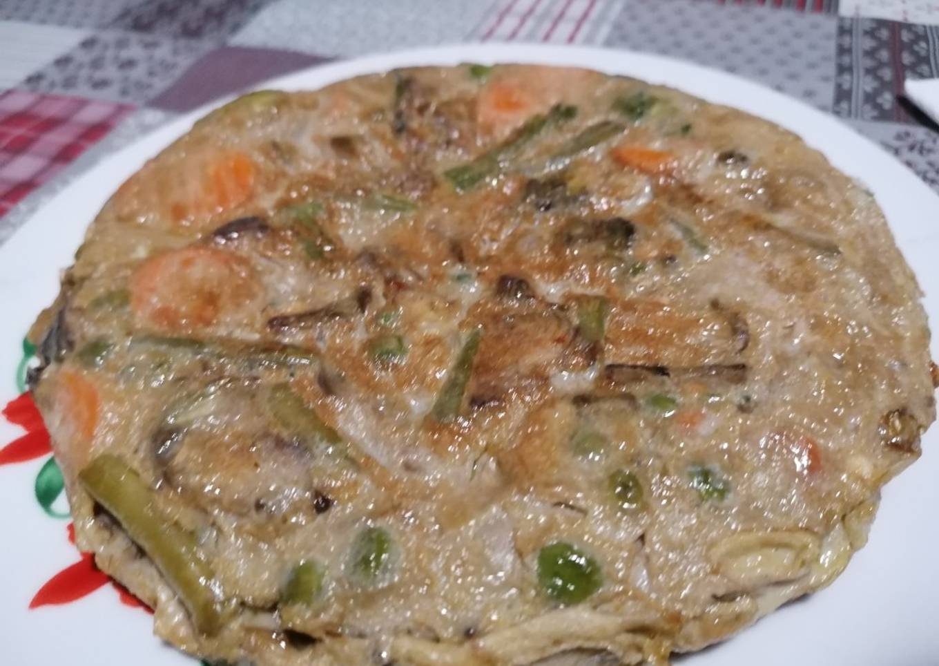 En principio mi idea era que la tortilla fuese solo de alcachofas, pero luego me acordé que tenía menestra en la nevera y se la añadí. Súper rica.